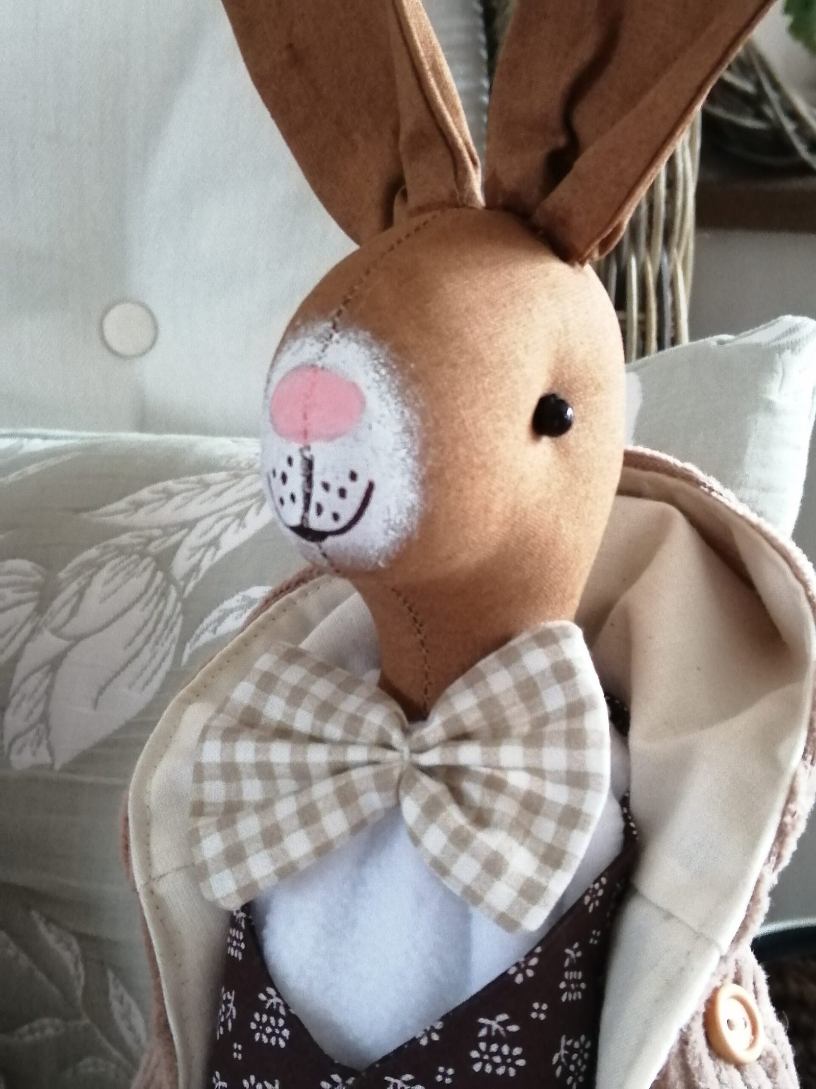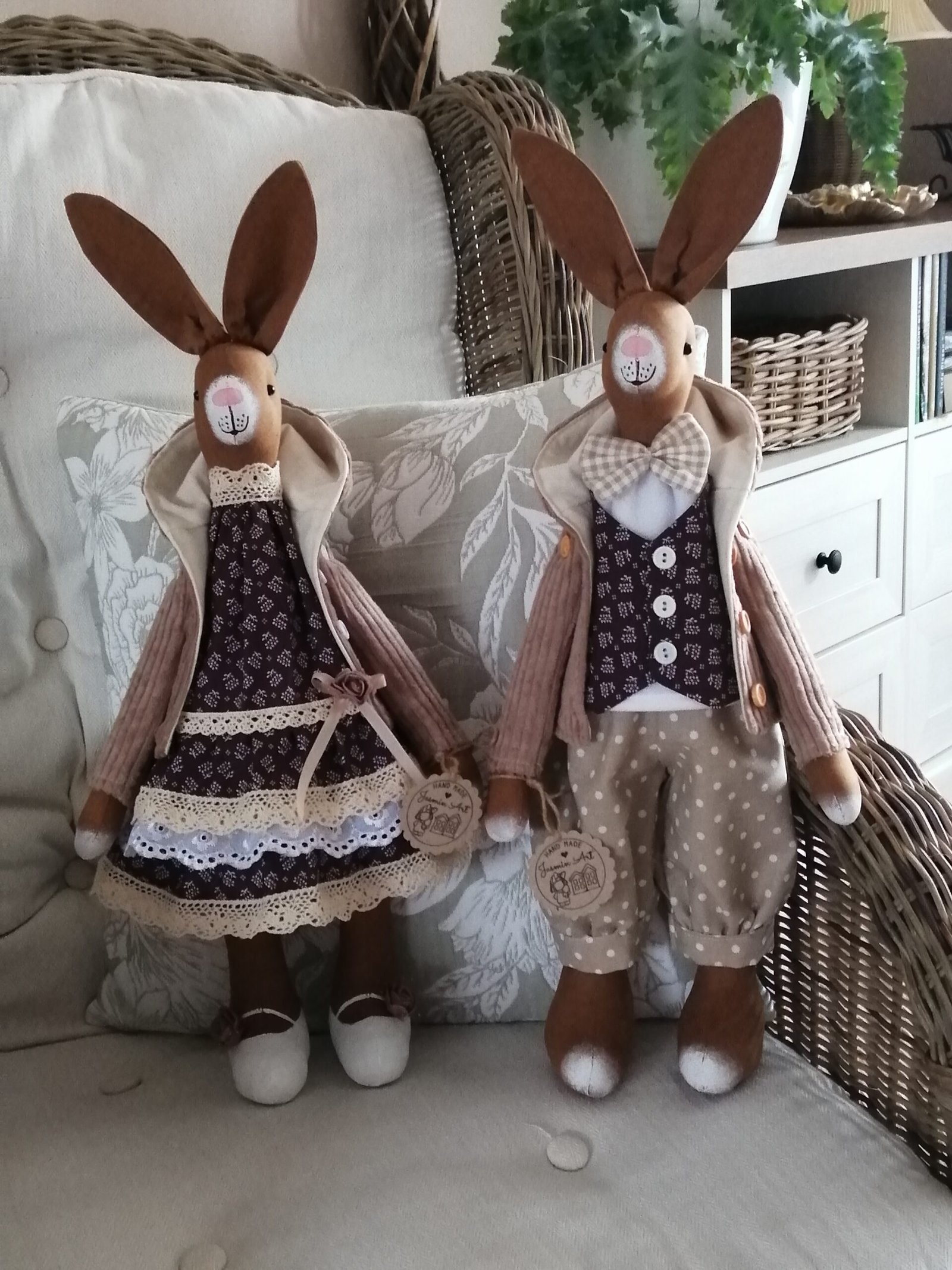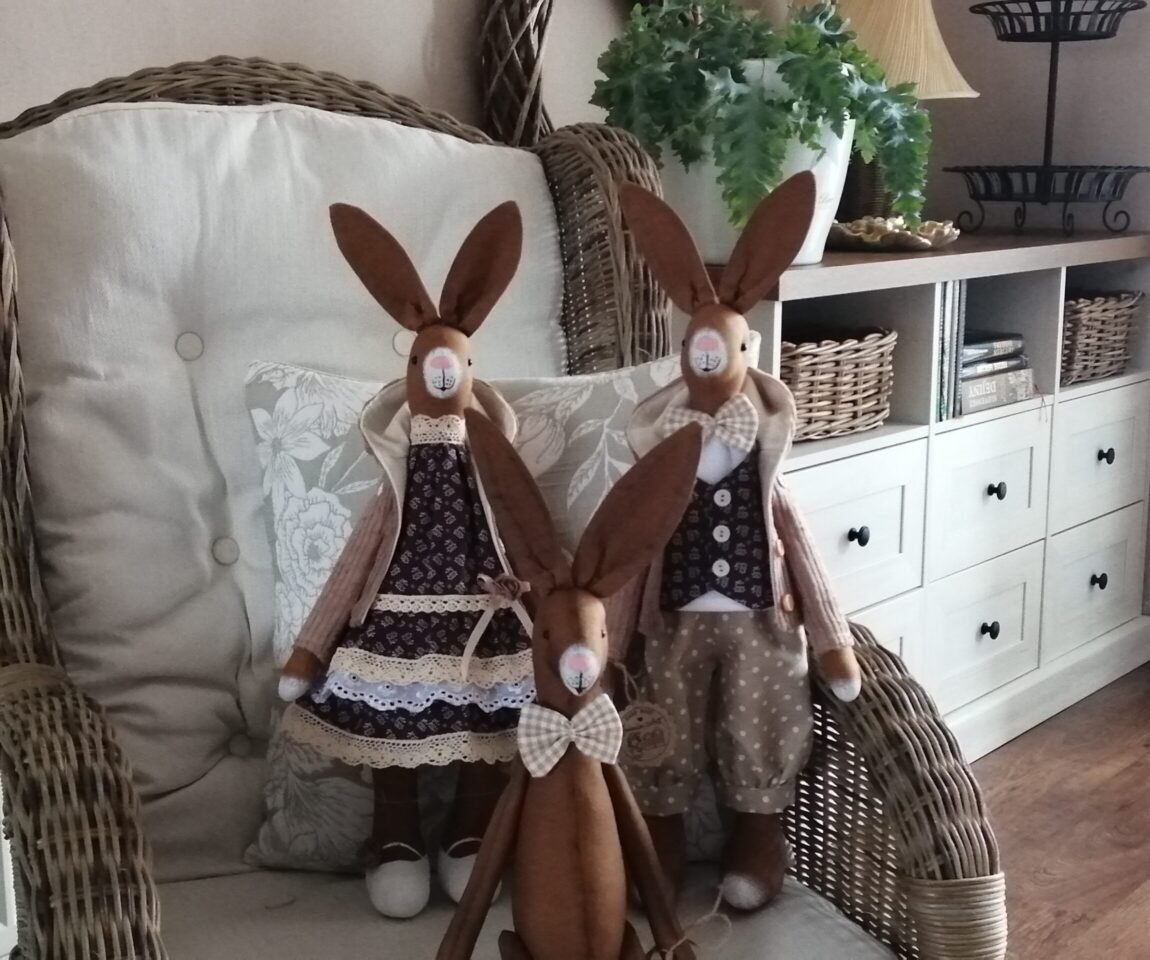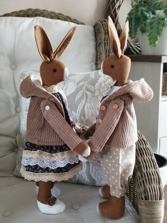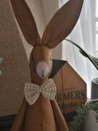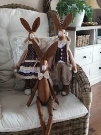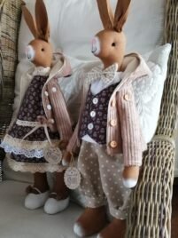 Máme pred Veľkou nocou a tak ste ma našťastie nenechali zaháľať a zasypali ste ma objednávkami. Práca mi osoží, myseľ sa popri rukách zamestná tiež a zostane menej miesta na pochmúrne myšlienky. Od môjho návratu domov poväčšine zajacujem, najviac sú v kurze naháčikovia s goliermi, keďže sa Veľká noc blíži. Občas prestriedam zajkov nejakou anjelkou, alebo drevenými domčekmi – záleží na vašich želaniach. Aj tento párik som robila podľa požiadavky – Elenka chcela niečo v rôznych odtieňoch hnedej a k tomu jedného naháčika s motýlikom. Verím, že spríjemnia veľkonočné sviatky. Ak sa vám zajkovia páčia a tiež by ste takých mali radi doma, na objednávku vyrobím, samozrejme aj v iných farbách podľa želania. Ponuku mojich zajkov a aj ostatných šitých dekorácií si môžete aj s cenami pozrieť v mojom obchodíku na sashe…