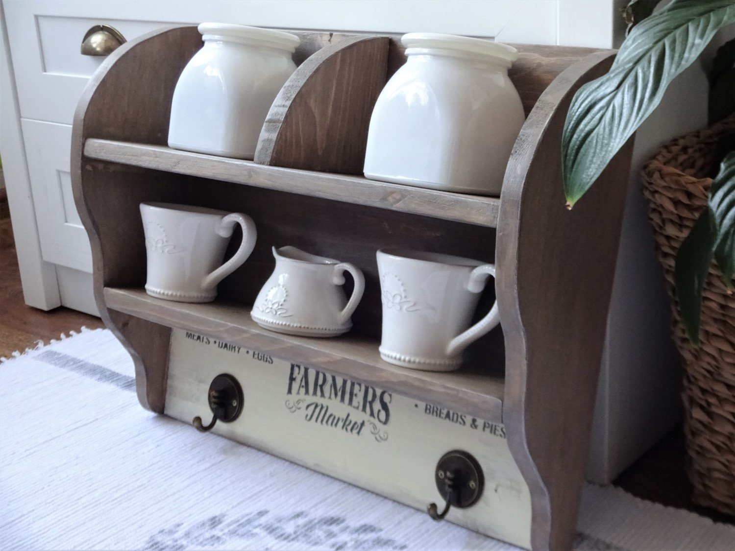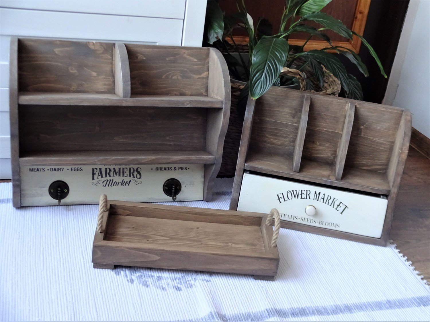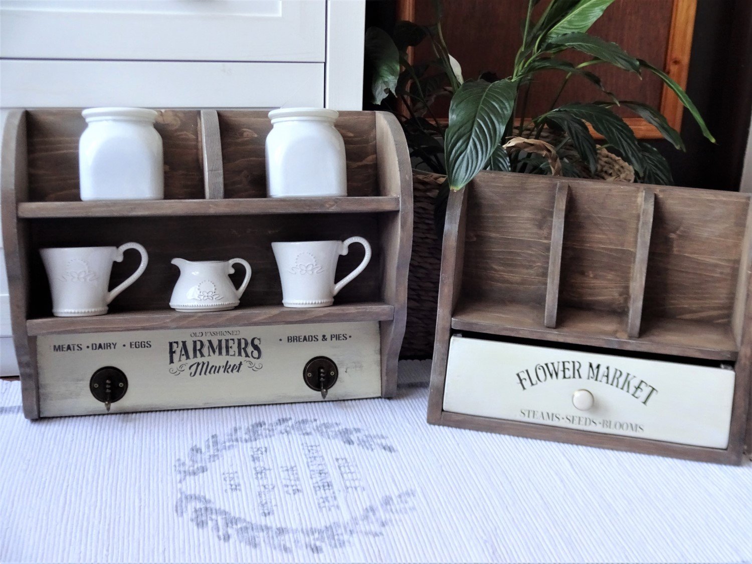 Vo vidieckom štýle sú obidve tieto police, ktoré vznikli v mojej dielničke v týchto dňoch. Svojím vzhľadom úplne dokonale zapadnú či už do kuchyne, na terasu, alebo na chalupu. Obidve sú zo smrekového dreva, morené ekomoridlom, maľované akrylovou farbou a konečná úprava je pamlak pre lepšiu údržbu. A úplne dokonale k nim zapasoval aj drevený podnos, ktorý je síce pre inú zákazníčku, ale svojím vzhľadom police krásne dopĺňa. Ak sa vám páčia, píšte si o ne. Na objednávku vyrobím aj v iných rozmeroch.